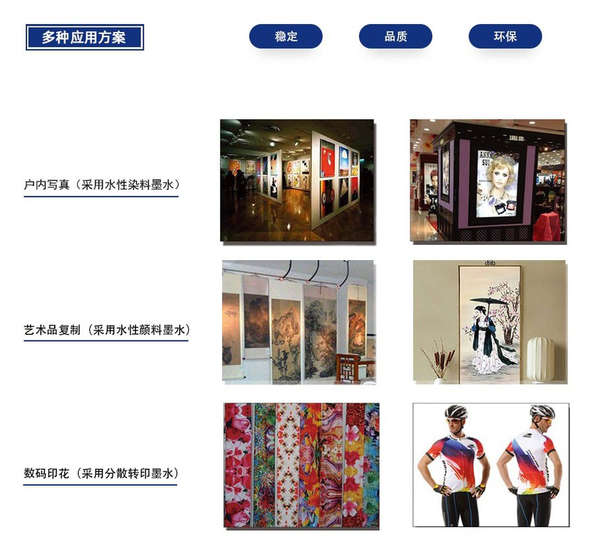 | 墨水系統(tǒng) | 墨水 | 水性染料墨水、水性顏料墨水、分散轉(zhuǎn)印墨水 |